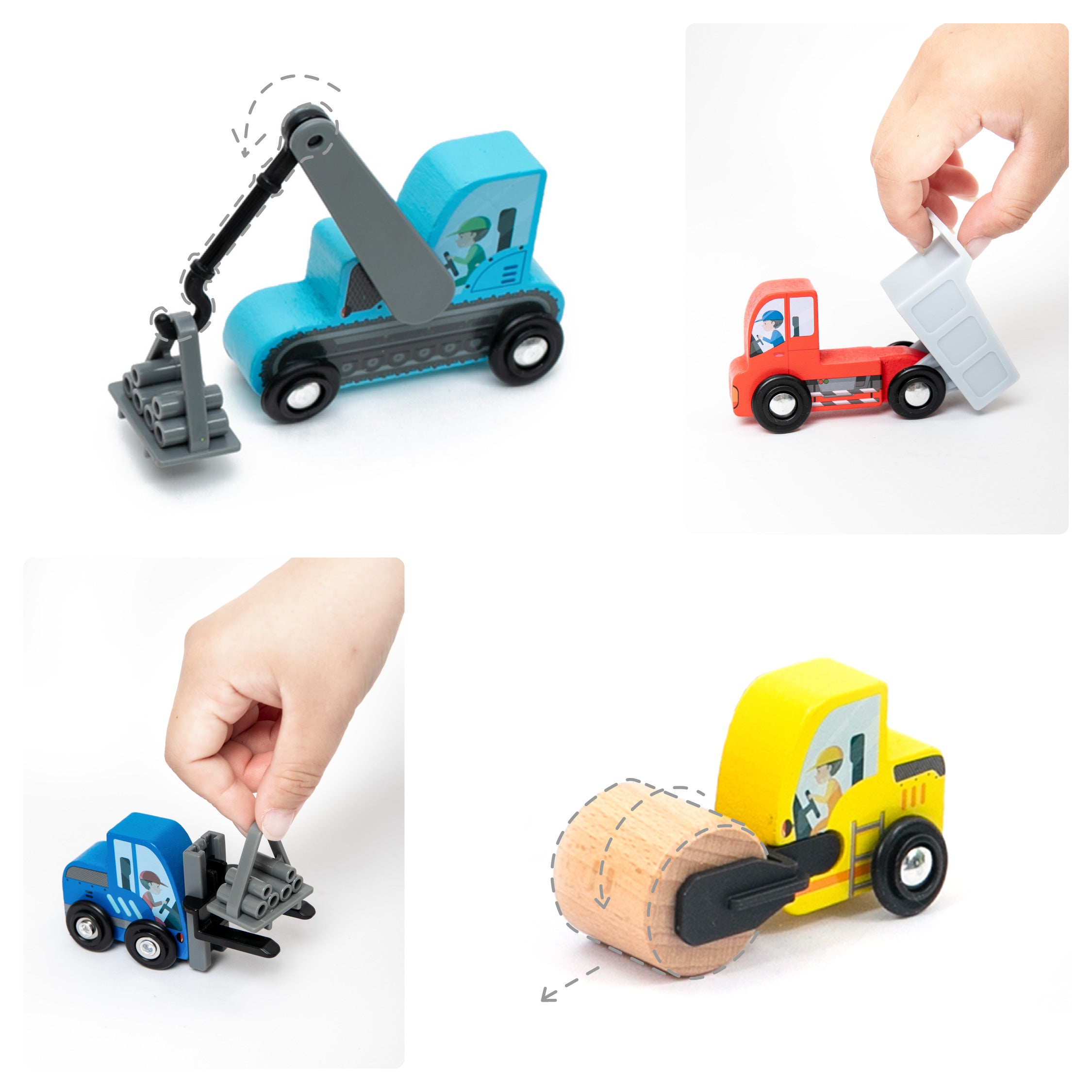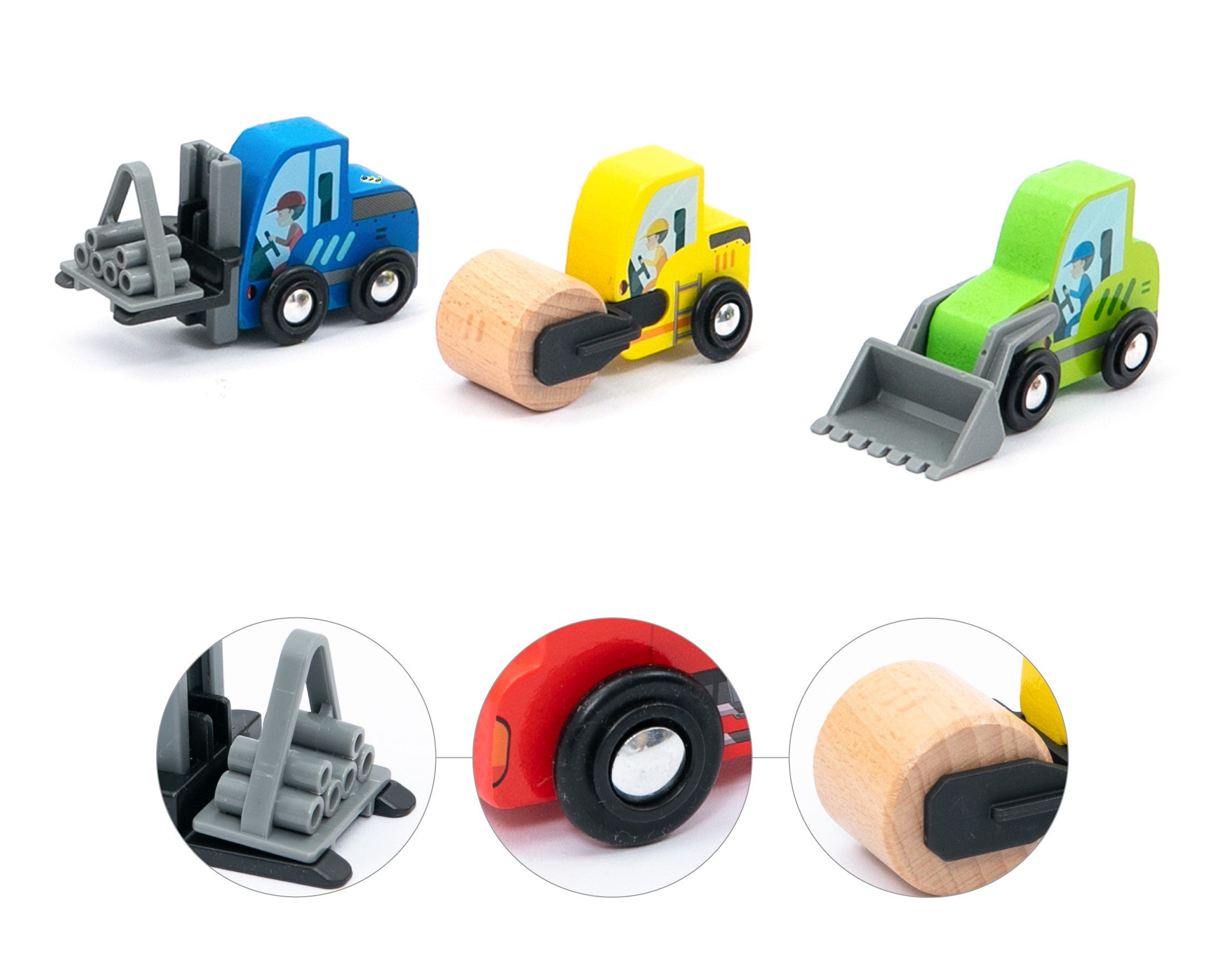 Das Set ist kompatibel mit Brio World Eisenbahn, Eichhorn Schienenbahn und anderen herkömmlichen Eisenbahnen. Die meisten Fahrzeuge haben bewegliche Arme oder andere bewegliche Teile. Zum Beispiel: Ein Gabelstapler kann eine Ladung Rohre aufnehmen und anheben, ein kleiner Kran kann diese Ladung ebenfalls transportieren usw.