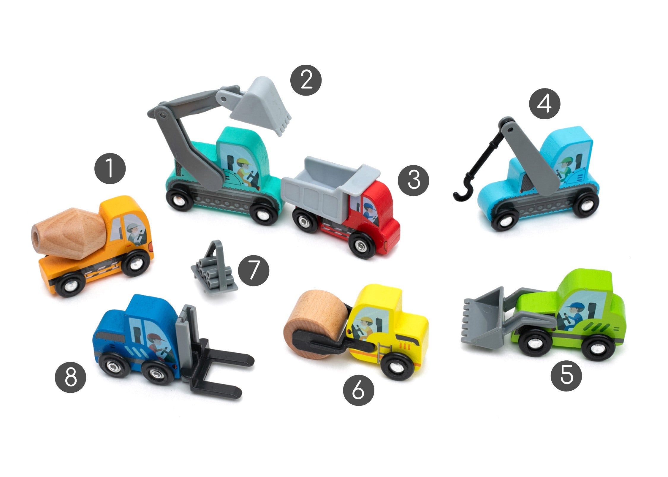 Dieses Holzspielset enthält: 1.) Betonmischer, 2.) Bagger, 3.) Lastwagen, 4.) Kran, 5.) Frontlader, 6.) Walze, 7.) Rohren, 8.) Gabelstapler