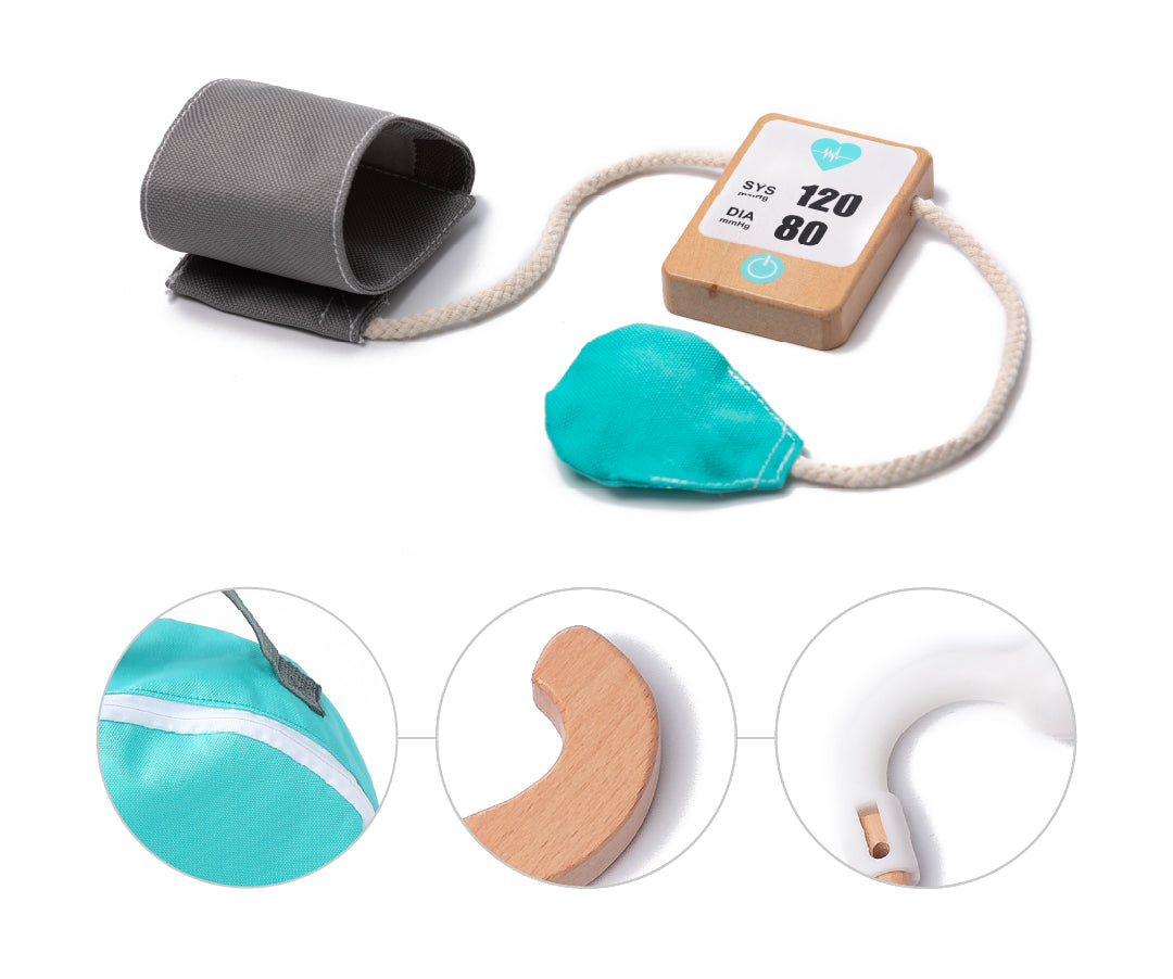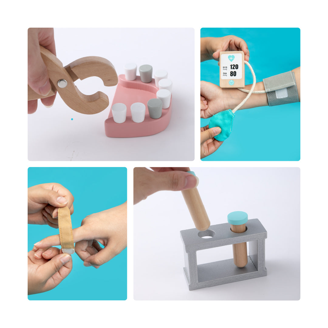 Dieses Holzspielset enthält: 1.) Flüssigseife, 2.) Seife, 3.) Kleine Schale, 4.) Zahnextraktionszangen, 5.) Reagenzglas-Halter, 6.) Arztkappe, 7.) Arztkittel, 8.) Hängeflasche, 9.) Runde Medizinflasche, 10.) Stethoskop, 11.) Sphygmomanometer, 12.) Modell eines Zahns, 13.) Pinzette, 14.) Schere, 15.) Desinfektionsmittel, 16.) Tabletten, 17.) Kapseln, 18.) 2x Röntgenstrahlen, 19.) 2x Wattestäbchen, 20.) Zungenschaber, 21.) 2x Reagenzglas, 22.) Mundspatel, 23.) Zahnbürste, 24.) Nervenhammer, 25.) Stirnthermometer, 26.) Thermometer, 27.) Pflaster, 28.) Stäbchen für Zahnseide, 29.) Salbe, 30.) Spritze, 31.) Zahnärztlicher Sondierungsstab, 32.) Mundspiegel und 33.) Arztkoffer
