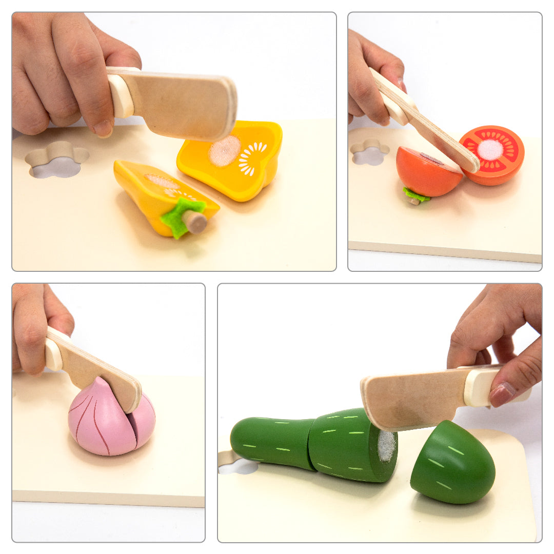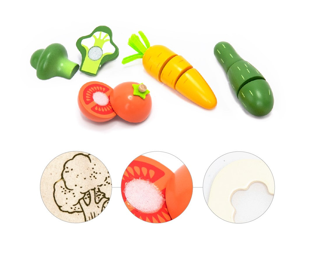 Die Gemüseteile werden durch Klettverschluss zusammengehalten, der einen angemessenen Widerstand bietet, so dass auch die Kleinsten ein möglichst realistisches Schneidegefühl erleben und ihre motorischen Fähigkeiten üben können. Das Design ermöglicht es Kindern gleichzeitig, die korrekten Formen und Farben der verschiedenen Gemüsesorten zu lernen und zu erkennen.