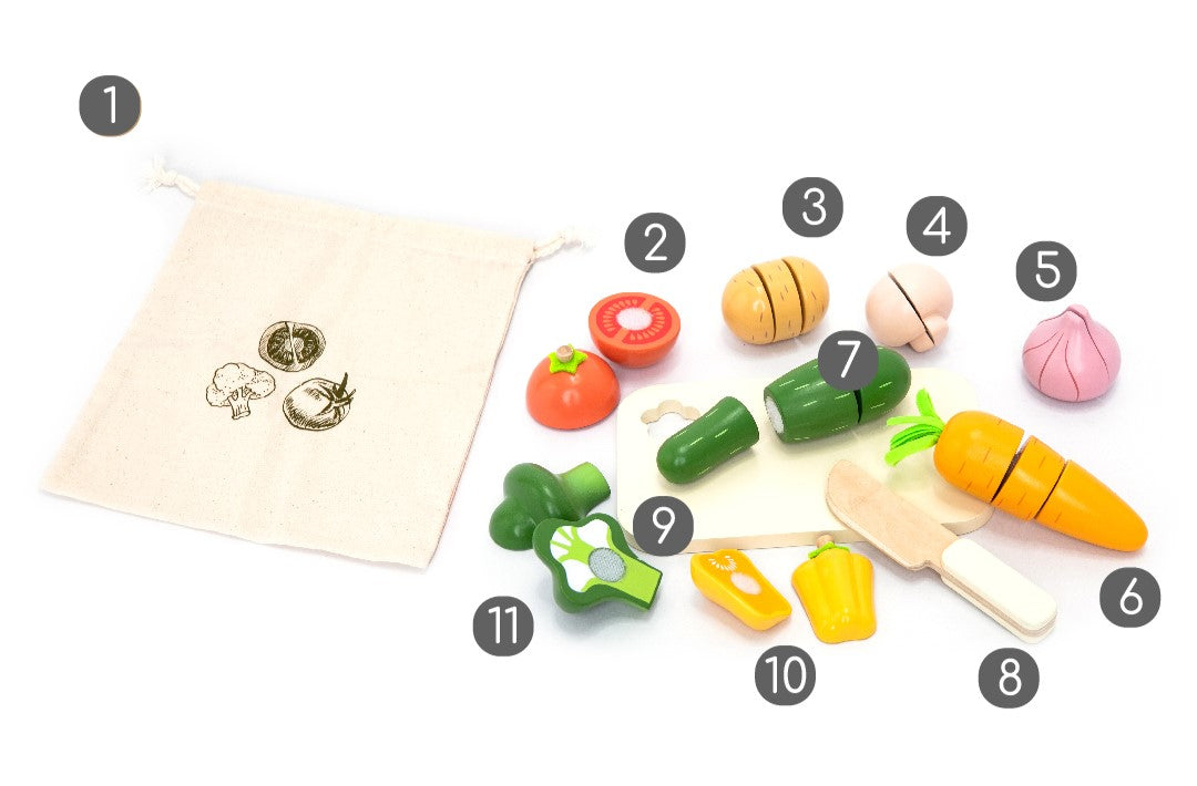 Dieses Holzgemüseschneideset enthält: 1.) Einen Gemüsebeutel, 2.) Eine Tomate, 3.) Eine Kartoffel, 4.) Einen Champignon, 5.) Eine Rote Zwiebel, 6.) Eine Karotte, 7.) Eine Gurke, 8.) Ein Messer, 9.) Ein Schneidebrett, 10.) Eine Paprika, 11.) Brokkoli
