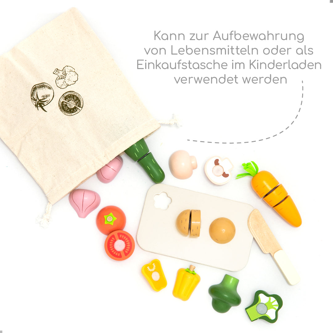 Zusammen mit dem Set erhalten Sie einen praktischen Beutel, der auf kreative Weisen genutzt werden kann. Neben der Aufbewahrung des Sets kann er zum Beispiel als Beutel für Lebensmittel beim Spielen des Einkaufens dienen.