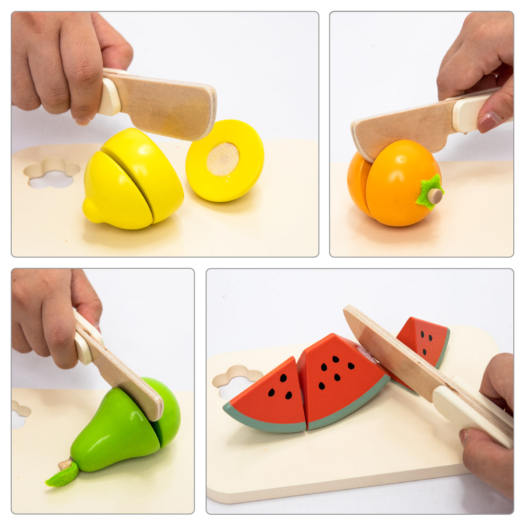 Die Obstteile sind mit Klettverschluss zusammengehalten, der einen angemessenen Widerstand bietet, damit auch die Kleinsten ein möglichst realistisches Schneidegefühl erleben und ihre motorischen Fähigkeiten üben können. Das Design ermöglicht es Kindern gleichzeitig, die korrekten Formen und Farben der verschiedenen Obstsorten zu lernen und zu erkennen.