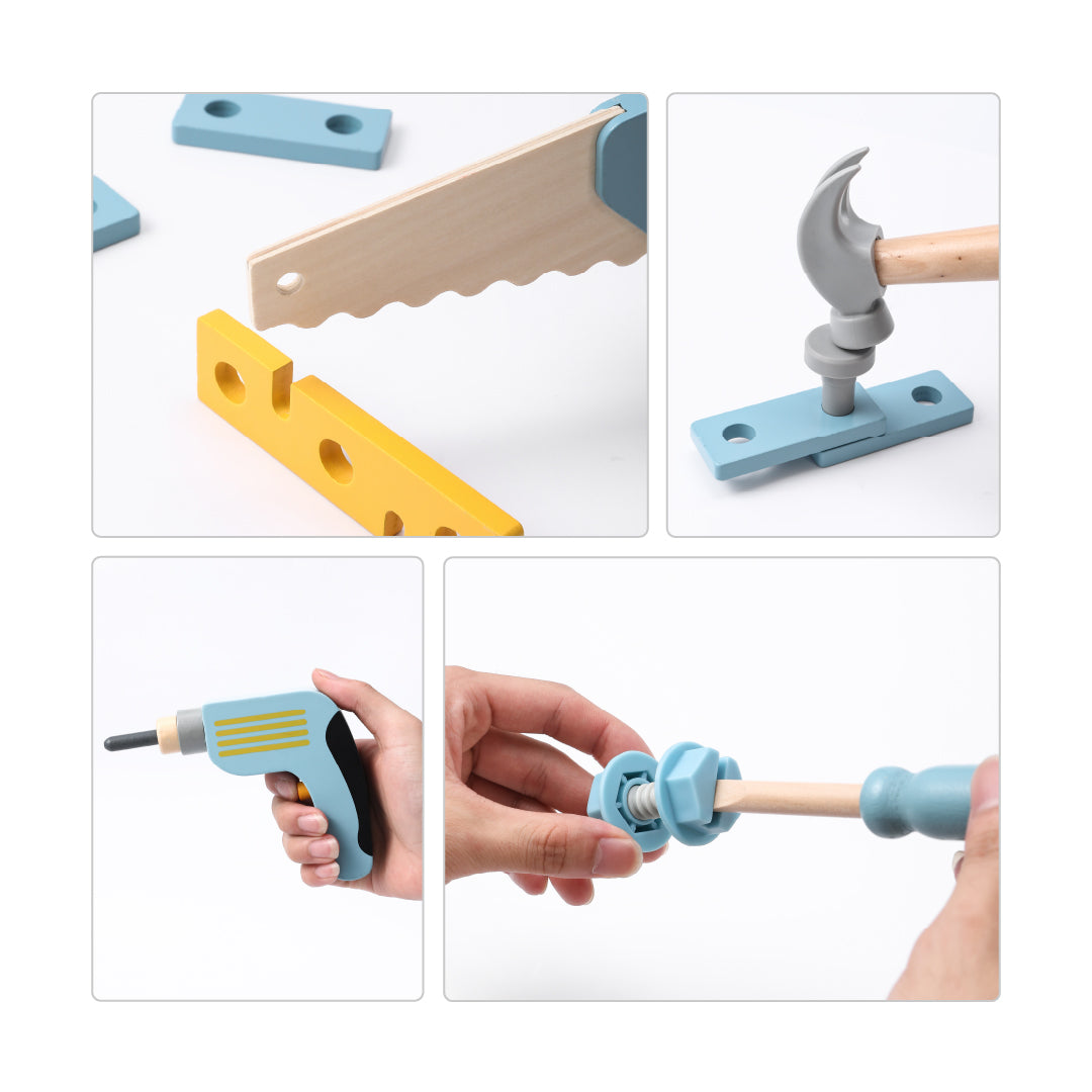 Ein Set, das so real ist, dass ein Kind direkt nachahmen und lernen kann, was es von seinen Eltern bei der Arbeit mit ähnlichen Werkzeugen hätte lernen können. Es ist möglich, die Teile mit Schrauben und einem Schraubendreher zusammenzubauen, die Teile mit Hammer und Nägeln zusammenzunageln, dann die Nägel mit einer Zange herauszuziehen usw.