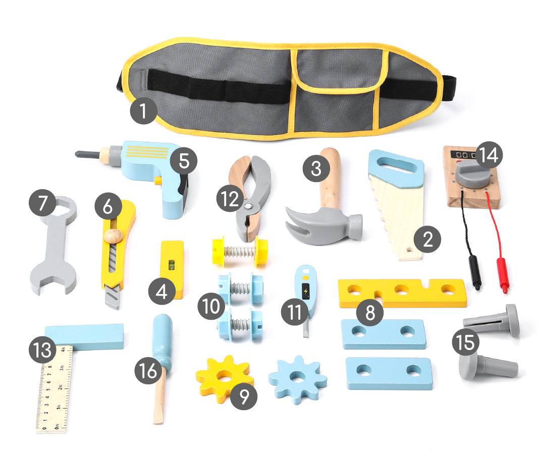 Dieses Holzspielset enthält: 1.) Werkzeuggürtel, 2.) Sägeblatt, 3.) Hammer, 4.) Wassergleiche, 5.) Bohrmaschine, 6.) Allzweckmesser, 7.) Schlüssel, 8.) Siegel, 9.) Zahnradstück, 10.) Schrauben, 11.) Elektrischer Stift, 12.) Zange, 13.) Ausreißwinkel, 14.) Multimeter, 15.) Nägel und 16.) Schraubendreher